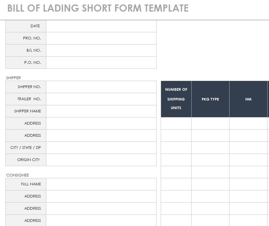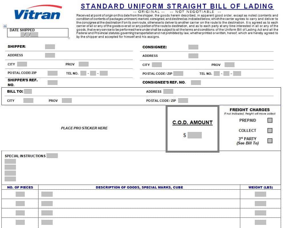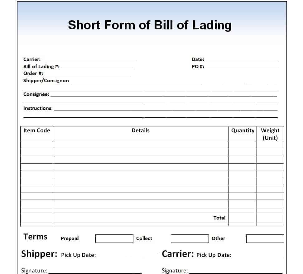 Straight Bill of Lading Template Short Form