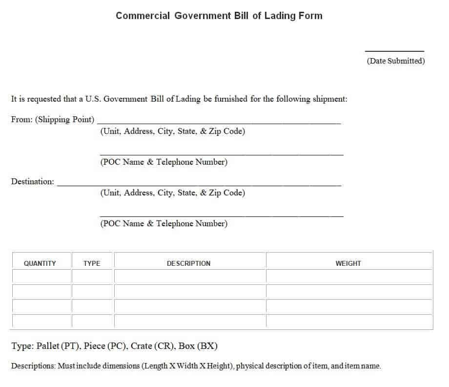 Commercial Government Bill of Lading Form