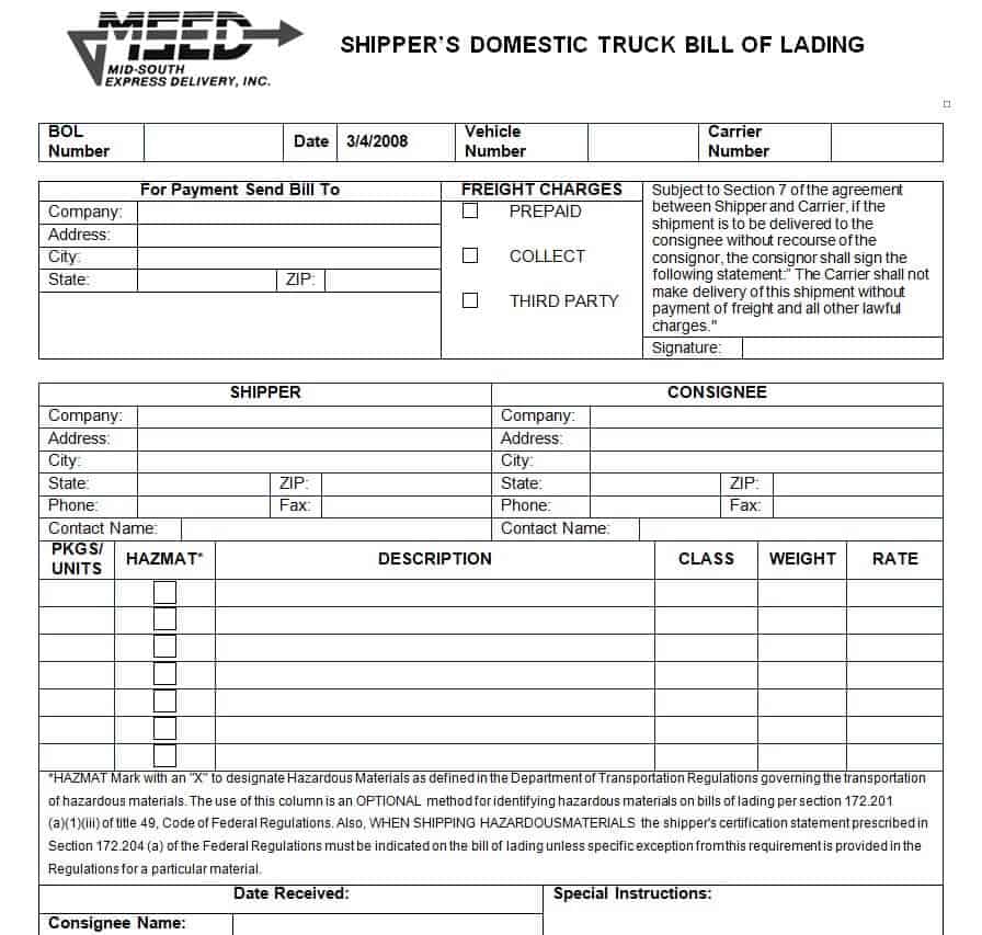 Shipper’s Domestic Bill of Lading Template WORD