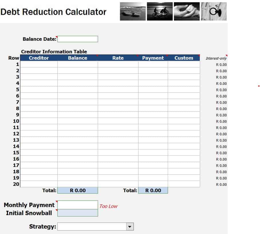 A debt reduction calculator enables you to pay off your debts faster using the rollover method. In this way after paying a major debt amount, you can easily pay down the next debt amount faster than before. It comes with blank fields that must be filled by the user with accurate details such as the amount of debt owed, agreed interest rate on debt, and addition of payment in debt payment each month to calculate how much you exactly can save by paying your debt before time. Debt snowball spreadsheets are also available on the internet to create debt reduction calculators on a personal computer.