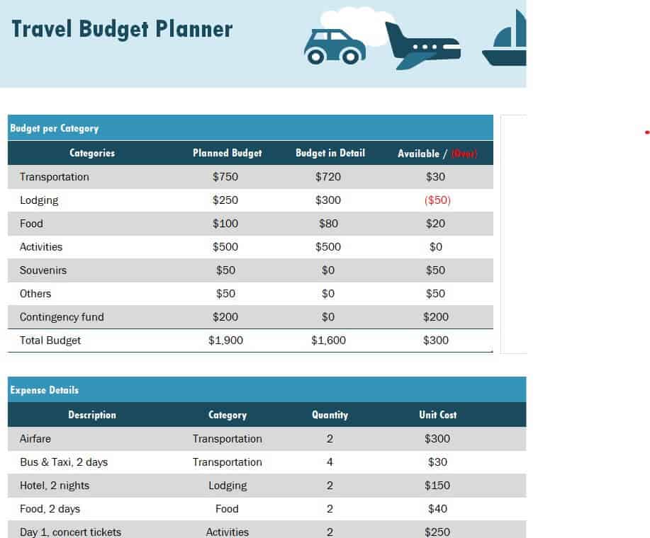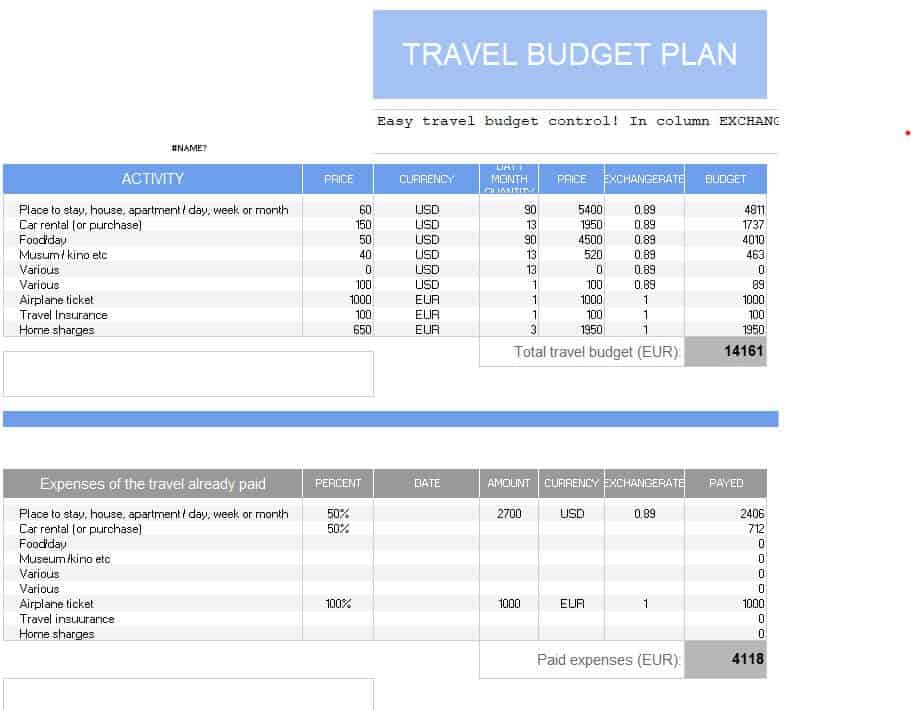 Special Travel Budget Planner Sample Excel
