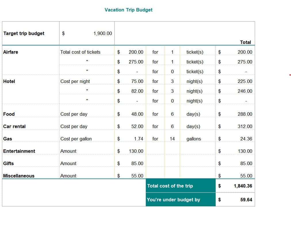 Sample Vacation Trip Travel Budget